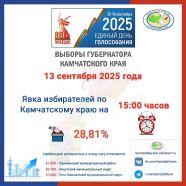 Активность избирателей на выборах Губернатора Камчатского края по состоянию на 15:00 часов 13 сентября 2025 года составила 28,81 %.