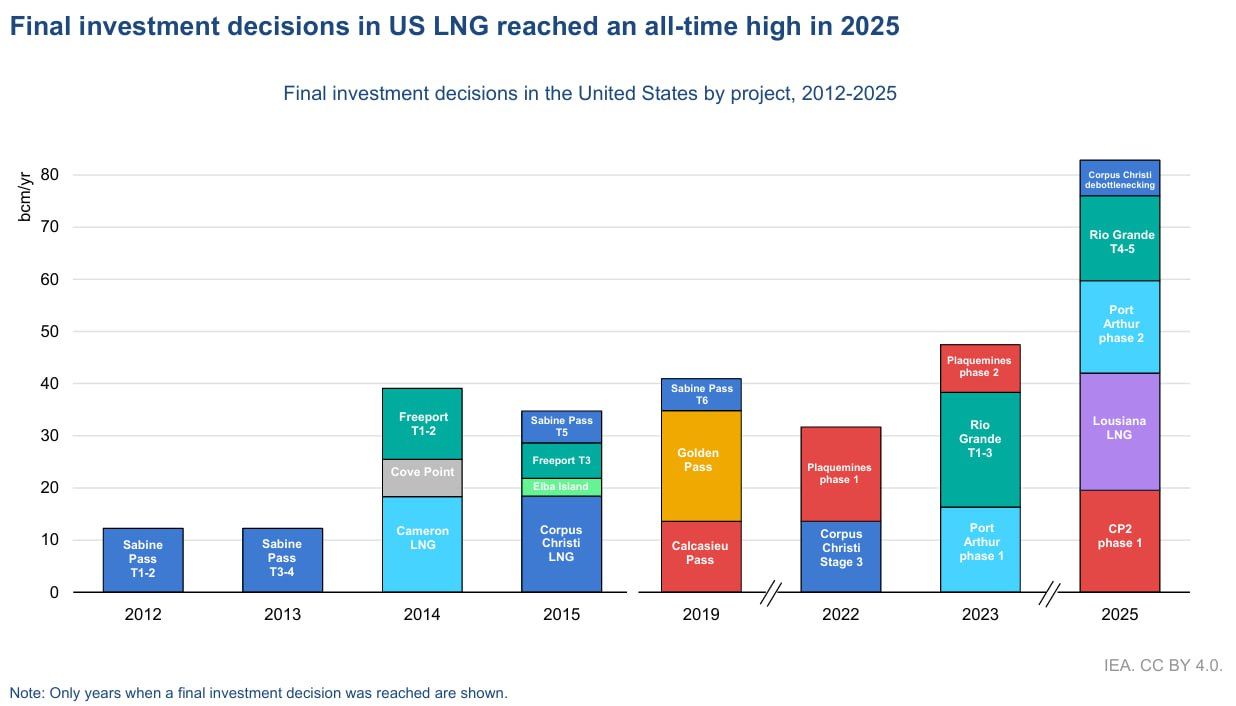В новом эпизоде сериала к власти приходит новый президент и со словами «бури, детка, бури» отменяет тот самый указ. Строители СПГ-терминалов, не веря в свое счастье, ломанулись и наоформляли рекордное число новых строек. Лишь за 2025 год в США подписано пять финансово-инвестиционных решений о строительстве СПГ-терминалов суммарной мощностью 85 млрд кубометров в год. И это к уже имеющимся мощностям на 150 млрд кубометров. То есть до конца десятилетия суммарные мощности СПГ-терминалов США приблизятся к 250 млрд кубометров в год.