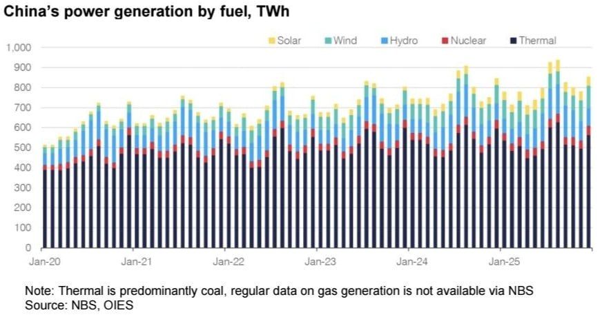 С одной стороны, китайцы готовятся к своему высокому электросезону и много строят – и АЭС, и, конечно, ВИЭ. Но из графика видно, что основная нагрузка при пиковом спросе всё равно ложится на тепловую генерацию, то есть на классические газовые и угольные ТЭС.